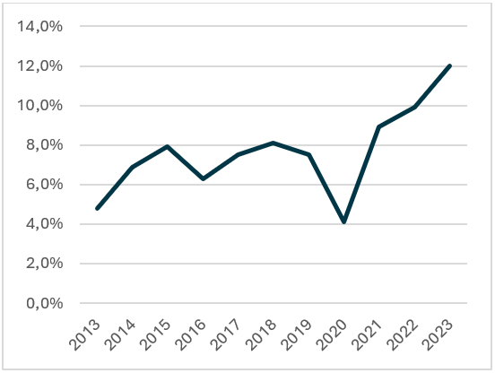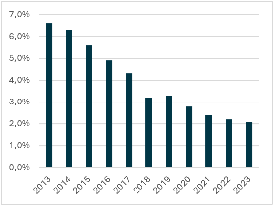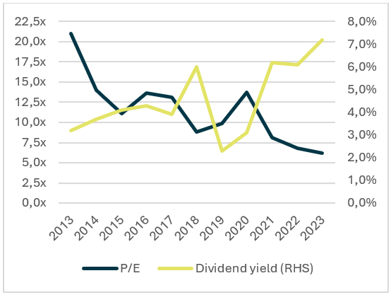 The relentless pressure of the multitude of headwinds faced by the sector meant that valuations were pushed to extreme lows. The recent strong improvement in profitability has led to a strong rally with banks being the best performing sub-sector in Europe since the end of May 2022 (Stoxx 600 sector total returns, 31/05/22 – 31/05/24) However, even after this rally on the back of normalising interest rates the sector remains attractively valued, trading at 7x forward earnings, with a dividend yield of around 7%.