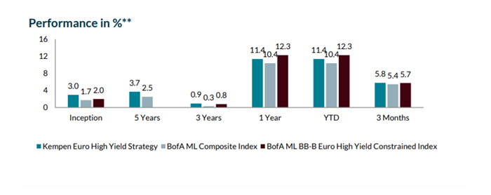 Looking back at 2023, the Kempen (Lux) Euro High Yield Fund outperformed the ICE BofA High Yield Composite Index (Q964) by 89 basis points over the twelve months ended 31 December 2023 (in EUR, gross of fees). This was despite applying stricter exclusion criteria during the second half of 2023. Our strong issuer selection more than offset the negative attribution from our conservative top down positioning. Our focus on BB rated companies with lower default risk exposure continued to deliver better risk-adjusted returns. We remained critical in our assessment of companies in primary markets, including those that issue green bonds, focusing on both fundamentals and use of proceeds. We managed to avoid investing in those companies that issued green bonds opportunistically to attract investors and were subsequently downgraded, such as Branicks Group and Graanul Invest. Since its launch in July 2017, the fund delivered annualised alpha of 1.2% (geometric, gross of fees) compared to the Q964 benchmark and 1.0% compared to the standard BofA ML BB-B High Yield Constrained Index.