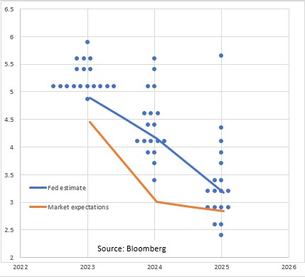 - Secondly, there are very large differences between what the Fed themselves expected and what market participants are expecting the future path of short rates to look like.