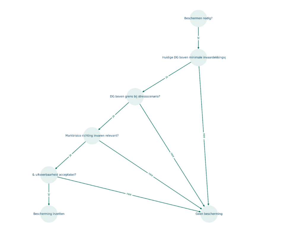 De beschermingsboom brengt besluitvorming terug tot een logische volgorde. Het bestuur kijkt eerst naar de huidige dekkingsgraad en de minimaal gewenste invaardekkingsgraad. Vervolgens wordt doorgerekend wat er gebeurt bij een forse, maar realistische marktschok, bijvoorbeeld een sterke daling van aandelen in combinatie met een beperkte rentedaling. Als uit deze analyse blijkt dat de invaardekkingsgraad onder druk komt te staan, kan bescherming in beeld komen.