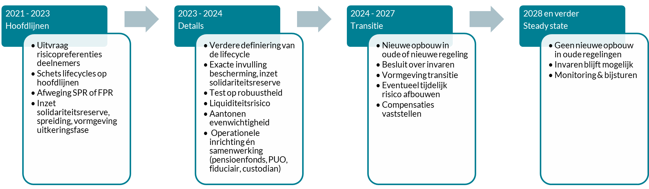 Veel pensioenfondsen zijn al bezig om op basis van de voorkeuren van deelnemers, de ambities en wensen van sociale partners en hun eigen inzichten een beeld te vormen van toekomstige regelingen. Hierbij richten zij zich (terecht) op de volgende punten: